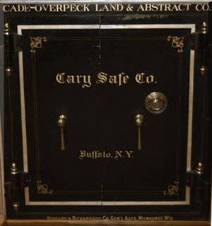 October 1903 photo of the founders of the Cade & Overpeck Land and Abstract Company in this office building. Tyler S. Overpeck (left) and Emmett A. Cade (right) specialized in helping homesteaders “prove up” their claims during the early 1900s. The safe behind Mr. Cade remains in the front of our office building.